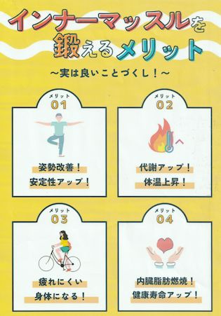 「東戸塚地域ケアプラザ」主催の 「男の自由時間・身体の痛み改善体操・ストレッチ」を聴講しました。 「良い姿勢とは」から始めて、良い姿勢を保つためはにインナーマッスルを鍛えることが 重要であり、これを鍛えることにより、姿勢が改善し、代謝がアップし、内蔵脂肪燃焼が進む など説明がありました。(インナーマッスルは、いわゆる白筋で持久力に関係し、 通常の赤筋は、瞬発力に関係するとのこと) ―以上―