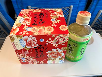 車中は混んでいて、三列席の真ん中B席でしたので、車外の様子も写すことも出来ませんでした。 岡山駅で購入した弁当(おむすびころりん)を食べました。