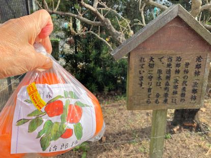 「治郎柿(次郎柿)」は、遠州森町原産です。治郎柿の誕生は、江戸後期の弘化年間頃に森町村五軒丁の「松本治郎」が 太田川の川原で柿の幼木を見つけ、これを持ち帰り自宅に植えたのがはじまりと言われています。